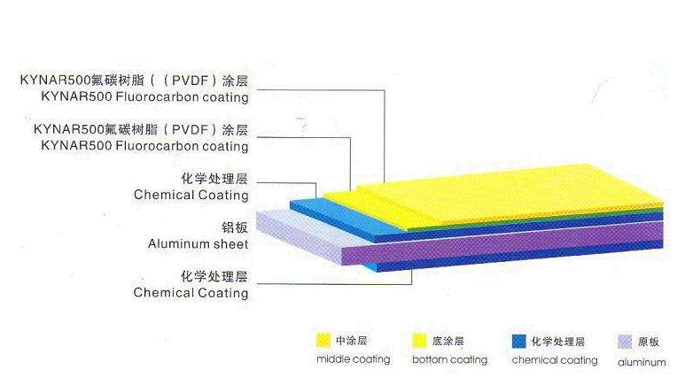 鋁單板是指經(jīng)過鉻化等處理后,再采用氟碳噴涂技術(shù),加工形成的建筑裝飾材料。氟碳涂料主要是指聚偏氟乙烯樹脂(KANAR500),分底漆、面漆、清漆三種。