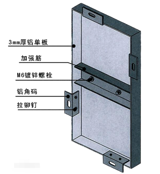 普通鋁單板其構(gòu)造主要由面板、加強筋和角碼組成。表面一般經(jīng)過鉻化等處理后,在采用氟碳或粉末噴涂處理。